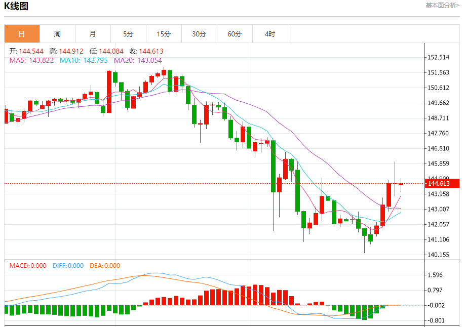 今天的预期交易区间在143.50支撑和145.00阻力之间