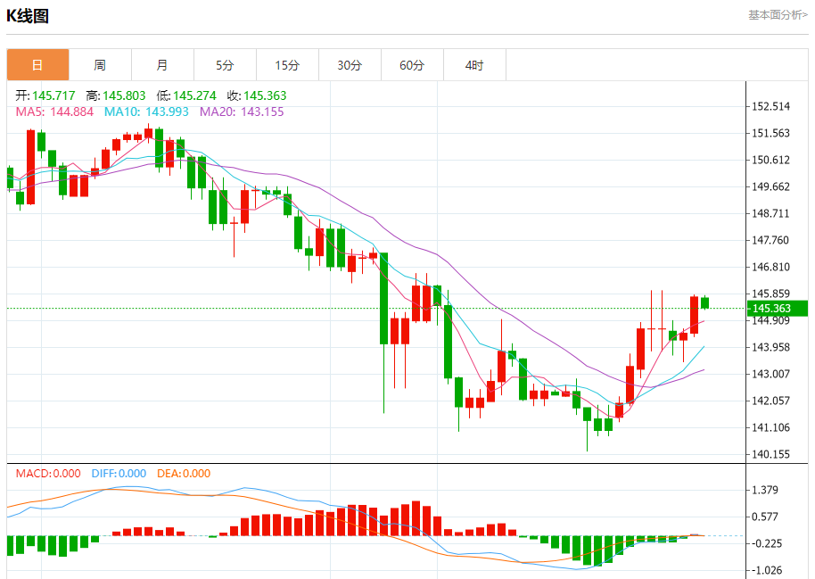 周四纽盘,美元兑日元交投于145.377,跌幅为0.27%。
