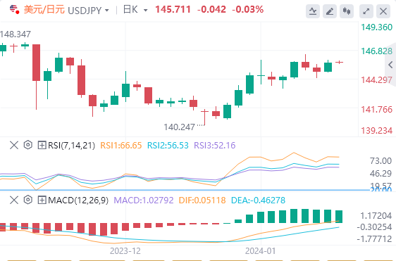 美元/日元周一上涨0.55%。美元/日元部分扭转了上周五0.27%的跌幅,收于145.676。美元/日元跌至144.839的低点,然后升至盘中高点145.942。