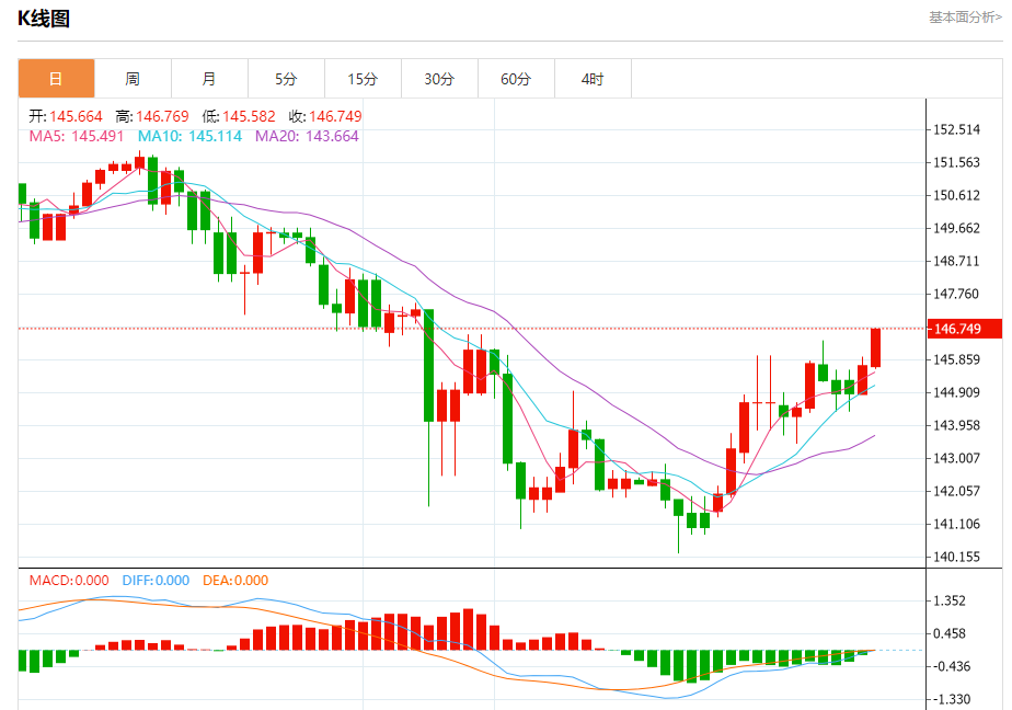 今日周二,截止目前美元兑日元报146.754,上涨0.72%。