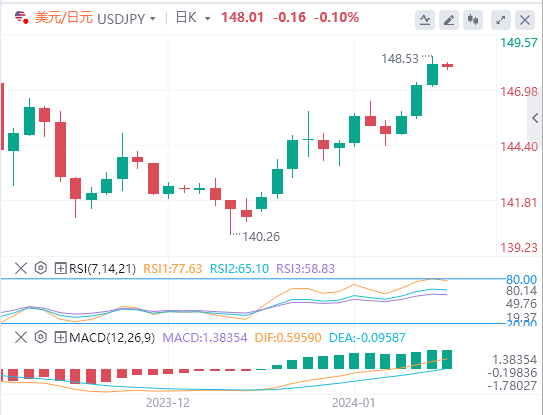 美元/日元周三上涨0.65%。继周二上涨1.03%之后,美元/日元收于148.142。美元/日元跌至147.053的低点,然后升至盘中高点148.526。