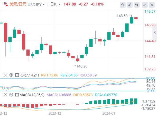今天的预期交易区间在147.50支撑位和148.90阻力位之间。
