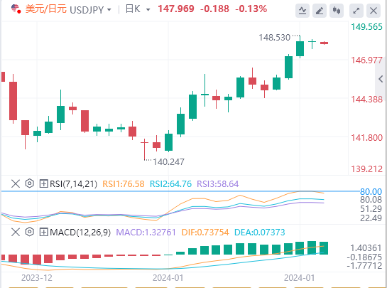 美元/日元周四收盘持平于148.144。周四,美元/日元跌至147.654的低点,然后升至盘中高点148.300。