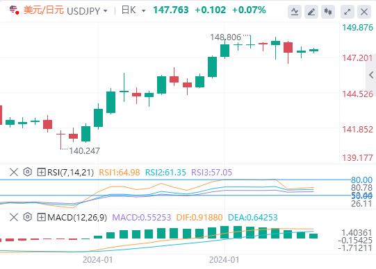 今天的预期交易区间在147.00支撑位和148.50阻力位之间。