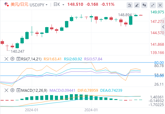 这美元/日元周一上涨0.24%。继上周五上涨1.30%之后,美元/日元收于148.671。美元/日元跌至148.265的低点,随后升至周一盘中高点148.894。