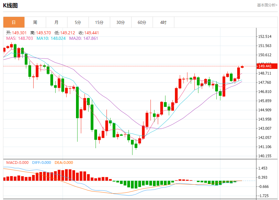 今日周五,截止目前美元兑日元报149.454,上涨0.10%。