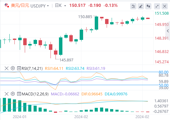 跌破150.201支撑位将使148.405支撑位发挥作用。14天RSI为63.94,表明美元/日元在进入超买区域之前将回到151关口。