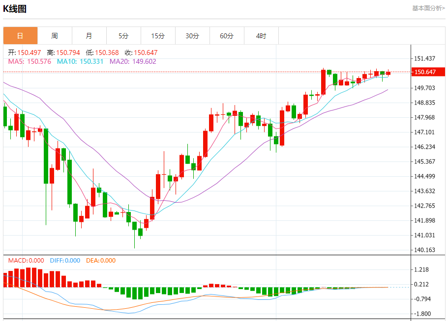 周三纽盘,美元兑日元交投于150.653,涨幅为0.10%。