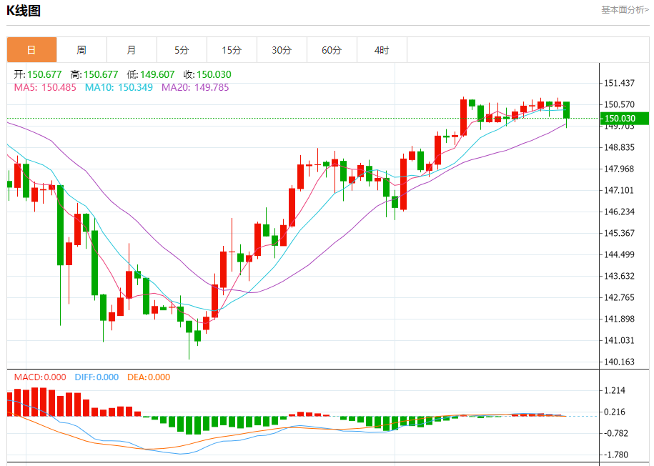 周四纽盘,美元兑日元交投于150.065,跌幅为0.42%。