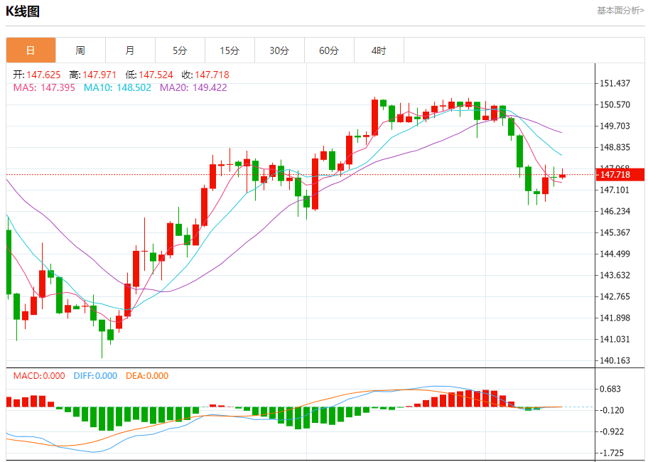 今日周四,截止目前美元兑日元报147.726,上涨0.06%。