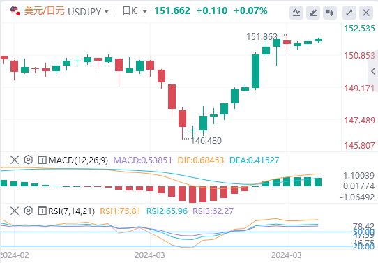 美元/日元远高于50日和200日均线,确认了看涨的价格信号。美元/日元突破151.685阻力位将支持其向152关口移动。