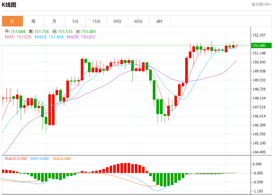 今日周四,截止目前美元兑日元报151.718,上涨0.01%。