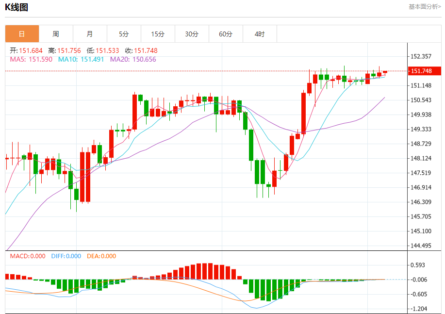 周四纽盘,美元兑日元交投于151.769,涨幅为0.05%。