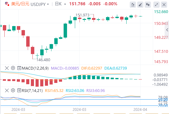美元/日元跌破151.685支撑位可能会让空头在50日均线运行。跌破50日均线可能会使148.529支撑位发挥作用。14天RSI为63.35,表明美元/日元在进入超买区域之前突破152水平。