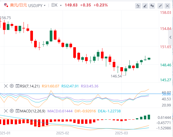对2025年上半年日本央行加息的支持可能会提振日元需求,推动美元/日元货币对升至3月11日的低点146.537。相反,对特朗普政策、工资增长和消费的担忧可能会推动该货币对走向3月3日的高点151.301。