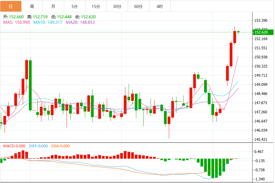 从日线图看,布林带明显张口,布林中轨148.236、上轨151.155、下轨145.318。今日价位已显著“走出”上轨之上,形成典型的“价外行走”与布林带宽扩张共振,显示上升趋势处在动能释放阶段。