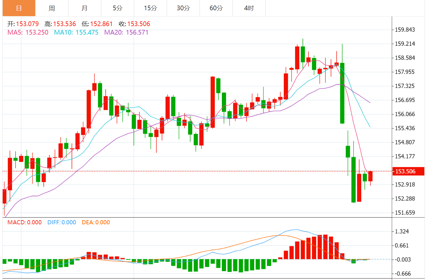 今日周四,截止目前美元兑日元报153.939,上涨0.79%。