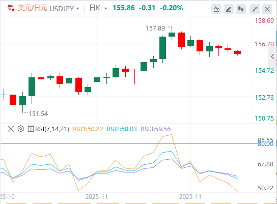 另一方面,任何有意义的反弹尝试现在都可能面临156.00整数前的直接障碍。若持续强势继续上涨,可能引发空头回补,直至156.65-156.70区间,美元兑日元可能重新夺回157.00关口。动能可能进一步延伸至157.45-157.50中间关口,最终达到11月达到的158.00附近多月高点。