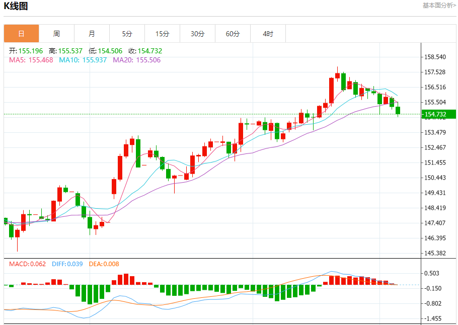周四纽盘,美元兑日元交投于154.748,跌幅为0.31%。