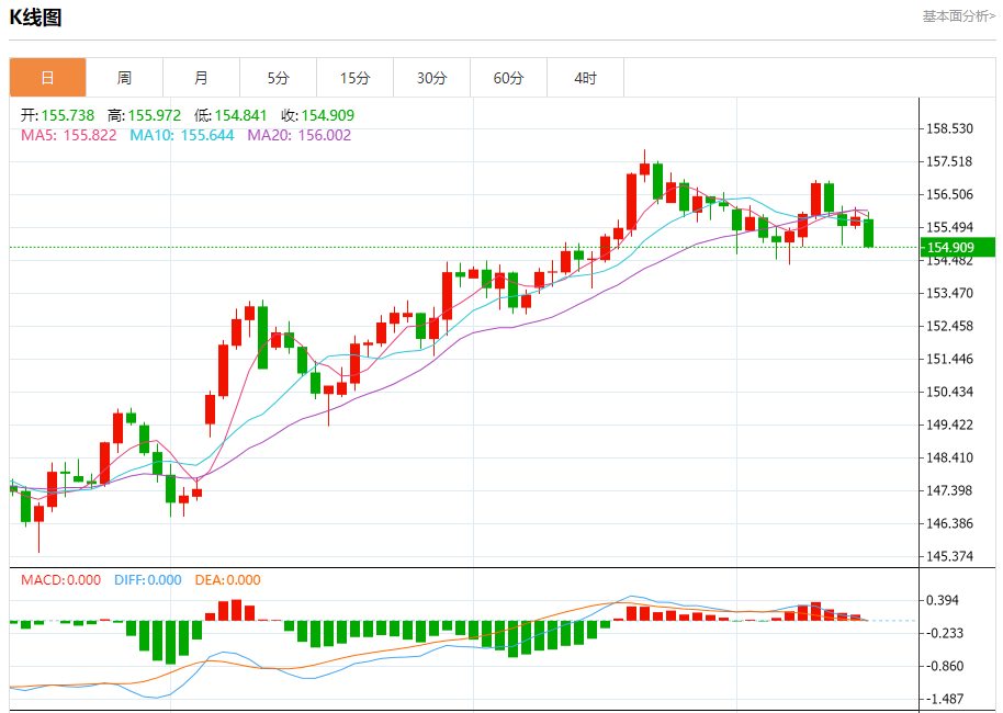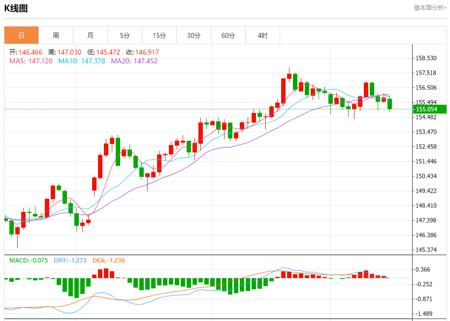 今日周一,截止目前美元兑日元报154.947,下跌0.58%。