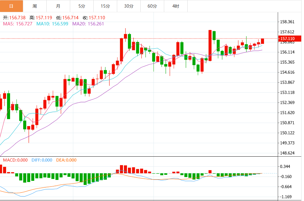 从日线结构来看,美元兑日元维持震荡偏强格局。汇价持续运行在主要均线系统之上,显示中期趋势仍偏向多头。近期价格回升并测试157.30附近区域,表明多头动能尚未完全衰竭。