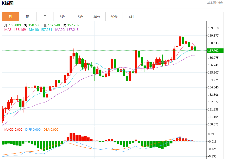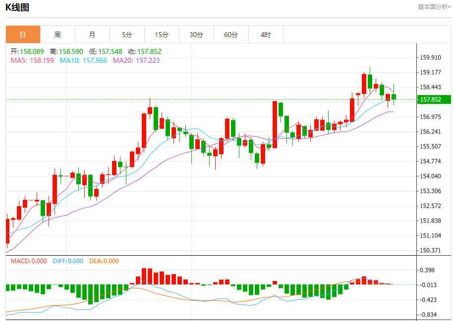 技术上,价格已跌破布林带中轨(158.13),并正在测试下轨(157.51)附近的支撑。MACD指标在零轴下方运行,DIFF与DEA线均呈负值且开口向下,显示短期下跌动能仍在积聚。关键的分水岭位于157.50区域,这不仅是布林带下轨所在,也是前期的一个重要震荡平台。若有效跌破,可能打开向156.80-157.00区间滑落的空间。