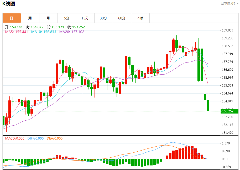 周二纽盘,美元兑日元交投于153.270,跌幅为0.59%。