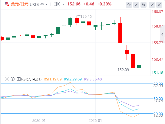 相对强弱指数(RSI)显示为30.94(超卖),可能出现暂停或修正反弹。从140.12低点测至159.19高点,38.2%回撤151.91提供初步支撑,若跌破则延续下滑。