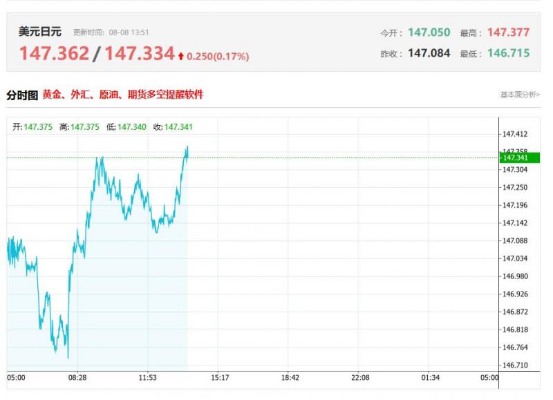 8月7日,日元在周四亚洲时段小幅走弱,原因是有报道称美国总统唐纳德·特朗普可能对所有日本进口商品征收15%的额外关税。再加上日本央行(BoJ)下一次加息可能时间的不确定性以及普遍积极的风险基调,削弱了避险日元。除此之外,美元(UD)从周三触及的一周多低点小幅反弹,推动美元/日元货币对在最后一小时回到147.00左