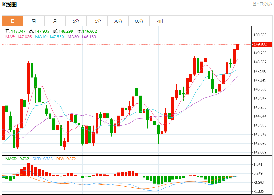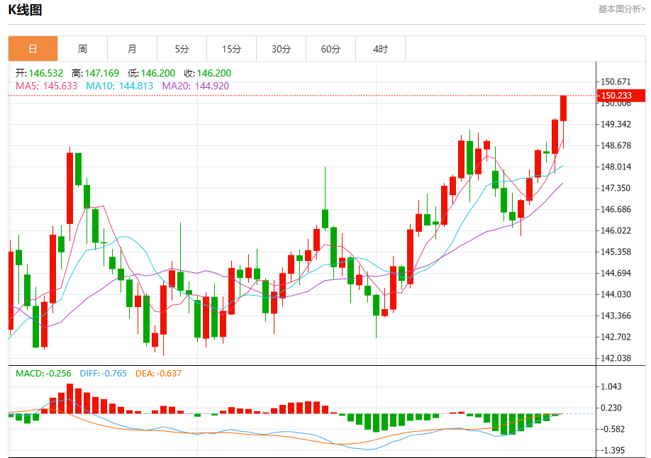 今日周四,截止目前美元兑日元报150.262,上涨0.50%。 日元基本面行情分析 日本央行维持利率不变符合市场普遍预期。日本央行在季度经济展望报告中上调了对本财年核心通胀的中值预测,主要反映出食品价格持续上涨的压力。同时,央行也小幅上调了对2026和2027财年的通胀预期,并略微提高了对本财年经济增长