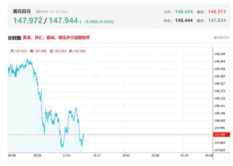 7月30日,周三欧洲交易时段,日元坚守盘中涨幅,加上美元普遍走软,使美元/日元货币对在周三欧洲时段早盘一直压低至148.00关口下方。在今天晚些时候美联储(Fd)做出关键决定和日本央行(BoJ)周四政策更新之前,市场的紧张情绪被认为有利于日元的避险地位。然而,在日本央行立即加息的押注减少之后,任何有意义的日元升
