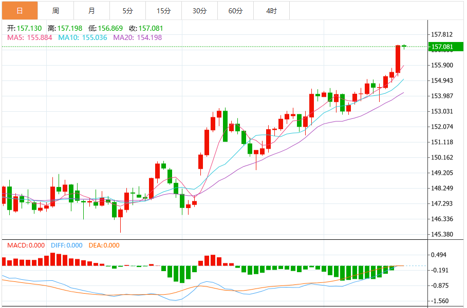 周四亚盘,美元兑日元一度上涨0.18%,刷新逾十个月高点达157.42,延续前三个交易日涨势。前一交易日美元兑日元录得约1.08%的涨幅,收报157.13,超越过去五个交易日的平均水平。这反映出日元短期持续疲软,而美元仍保持强劲势头。近日持续积累的买盘压力在隔夜美联储会议纪要公布后进一步增强,暗示12月利率决策可能采取