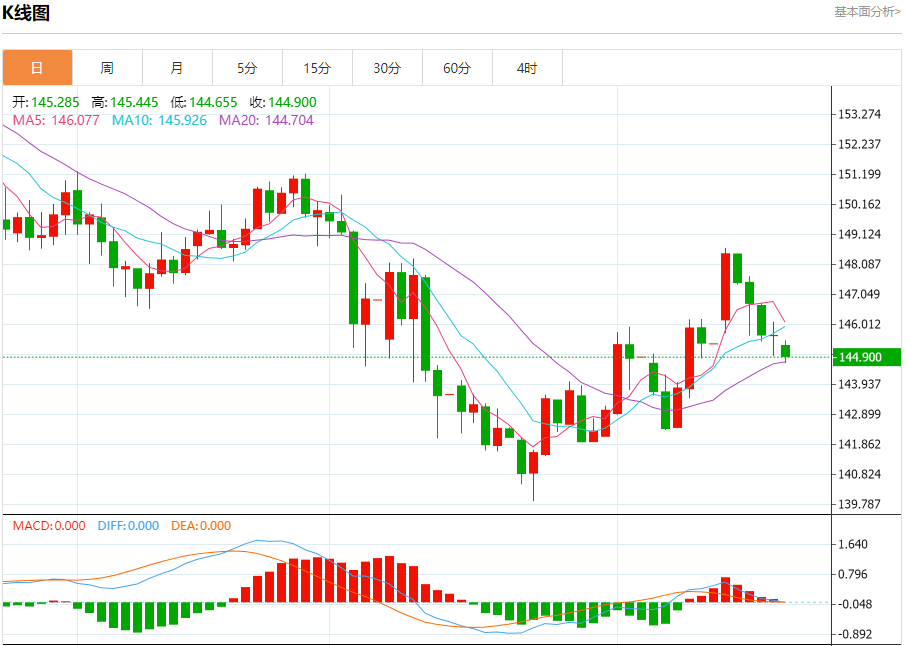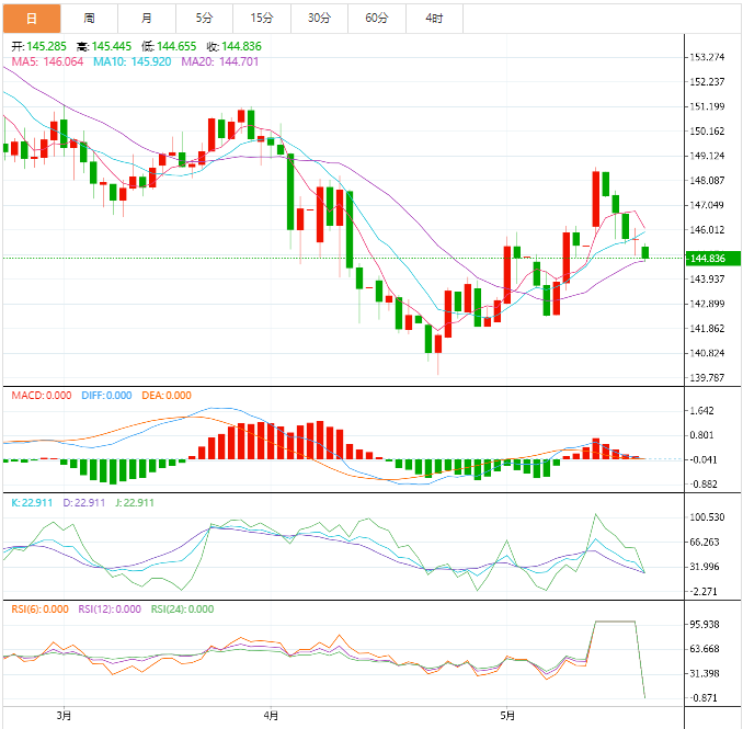 周一(5月19日),外汇市场上美元兑日元呈现出一系列值得关注的动态。美元兑日元汇率今日开盘报145.2850,昨日收盘于144.8360,截至发稿前美元/日元汇率报144.8360,跌幅0.45%,最高价145.4450,最低价144.6550。 货币兑:美元/日元 一、行情分析 (一)日线图走势 从日线图来看,美元兑日元(UD/