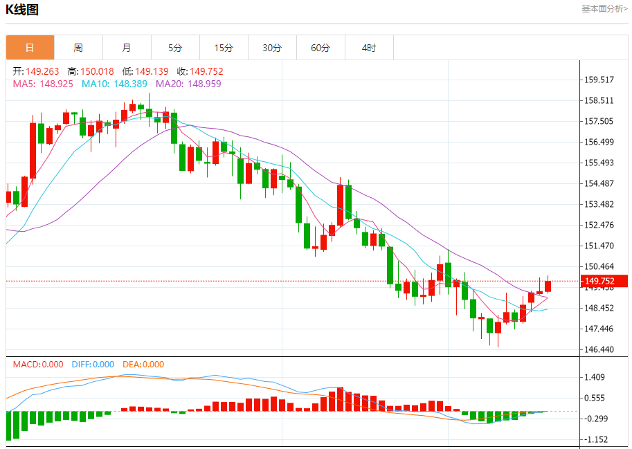 今日周三,截止目前美元兑日元报149.844,上涨0.38%。 日元基本面行情分析 日本央行19日宣布,维持现行利率水平不变,继续将政策利率保持在0.5%水平。 央行公告显示,出席货币政策会议的9名央行审议委员一致通过维持现行利率的决定。 日本央行行长植田和男在当天的记者会上说,日本经济与物