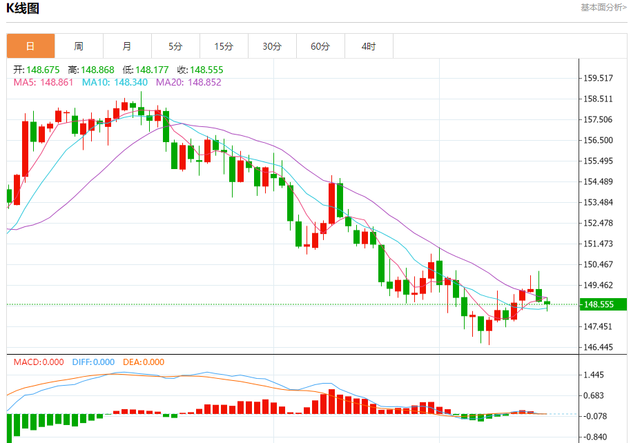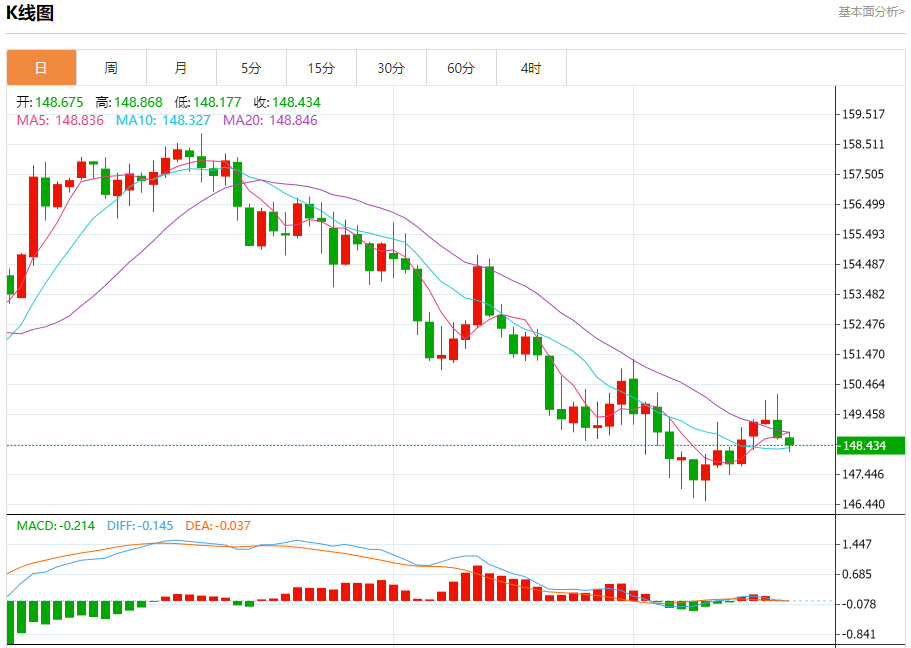 周四亚盘,美元/日元徘徊于148.23附近,日内下跌0.29%。 市场基本面分析 美元/日元在周三因联邦公开市场委员会(FOC)决定维持利率不变而上涨。尽管官员们对利率持谨慎态度,但美元(UD)未能大幅反弹。该货币对徘徊在149.37附近,几乎没有变化。 在其货币政策声明中,美联储(Fd)承认劳动力市场状况依然稳健,但