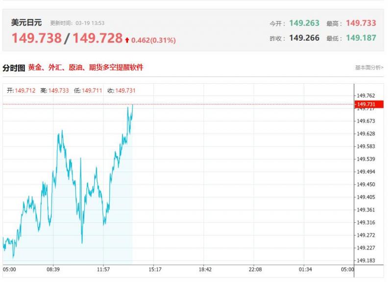 美元兑日元今日汇率最高149.733,最低149.711,涨跌0.462,涨跌幅0.31%。 市场基本面分析 日本央行在最新货币政策声明中宣布维持政策利率在0.5%不变,符合市场预期。此前,接受调查的52位经济学家均预计本次会议不会调整利率,而13%的受访者认为央行可能在4月至5月采取行动。日本央行谨慎观望,未来政策调