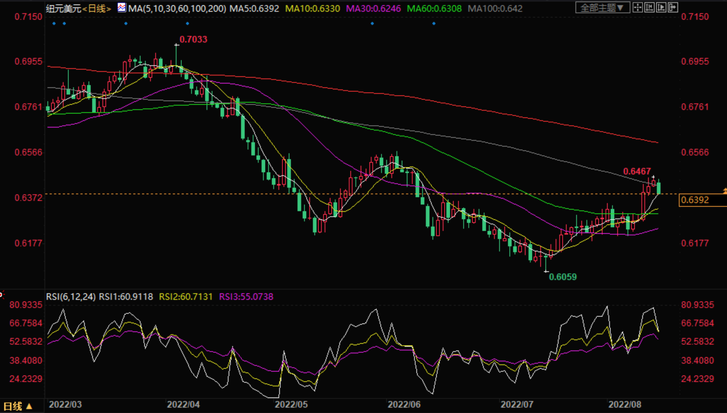 基本面上,中国7月份零售销售年率降至2.7%,低于期值5.0%和前值3.1%,而工业生产(IP)则从前值3.9%和期值4.6%小幅下降至3.8%。由于全球最大贸易伙伴中国的经济数据疲弱,纽元/美元出现自4月26日以来的下行倾向阻力(最新在0.6465附近)期待已久的回调。纽元/美元最新下跌也验证相对强弱指标自超买区域出现回落是合理的。