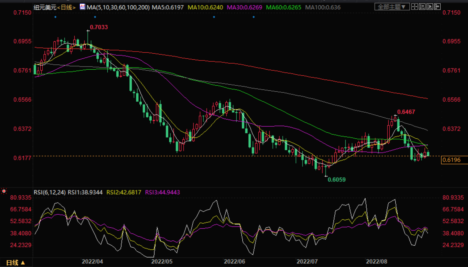 技术面上,纽元/美元维持疲弱处在0.6200 关口附近,再次从50日均线关口反转。同样令纽元/美元空头维持期待的是MACD 信号的悲观且相对强弱指标 (14)疲弱,未处在超卖。如果纽元/美元空头继续跌破 0.6130,0.6100 整数关将成为支撑,然后汇价将跌至年线低点0.6060 附近。若纽元/美元日线收盘突破50日均线0.6235附近,则汇价将迅速上涨接近0.6300关口。