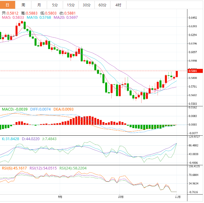 基本面上,纽元兑美元多头自8月底以来首次攻击50日MA均线的阻力位,因为美元回落。汇价逐步走高至0.5865,同时料录得一周最大单日涨幅。展望未来,新西兰第三季度就业数据以及纽储行行长奥尔讲话将是汇价走势关键。若新西兰基本面强劲以及纽储行鹰派讲将推动该货币对进一步上扬。美联储的鹰派评论以及不愿讨论从12月开始放慢加息步伐可能会提振美元并打压该货币对。此外美国10月ISM制造业指数以及S&P Global採购经理人指数也将推动交易员。