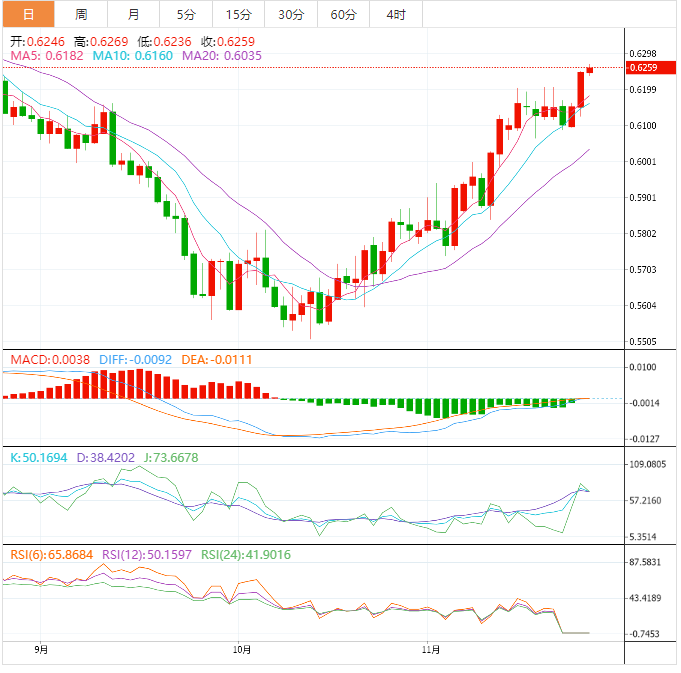 基本面上,新西兰储备银行行长表示,新西兰储备银行现金利率正式处在紧缩政策当中,原因是新西兰储备银行试图降低通胀。纽元/美元目前处在上涨当中,已经走高刷新高位,再度突破0.6250区域,正接近近三个月来的最强水平。新西兰储备银行宣布大幅加息75个基点,要走在通胀前面。这次加息是新西兰储备银行自1999年以来对官方现金利率实施的最大幅度上调,并使政策利率达到14年高水平4.25%。同时,新西兰储备银行在声明中称,央行董事会最新预测,预计现金利率将在2023年9月达到峰值5.5%。此外,美联储会议纪要发布鸽派论调也助推纽元/美元上涨。