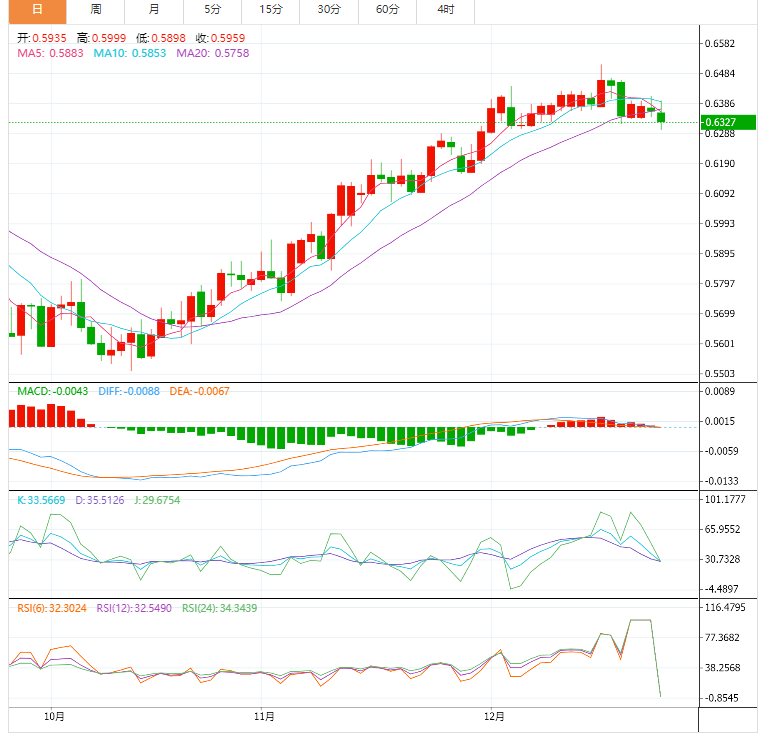 基本面上,纽元/美元下跌空间不断缩小,发稿时纽元/美元跌至日线新低,自高位0.6365下跌,跌幅0.35%。美元一直试图突破高位,这给了大宗商品市场一些喘息的空间,但情况正出现变化。近几周美元承压,因投资者预计美联储(Federal Reserve)迟早会调整货币政策。这一预期一直提振纽元/美元。然而,美股週一开盘疲弱,加上国内数据低迷,周初这一市场环境打压美元。