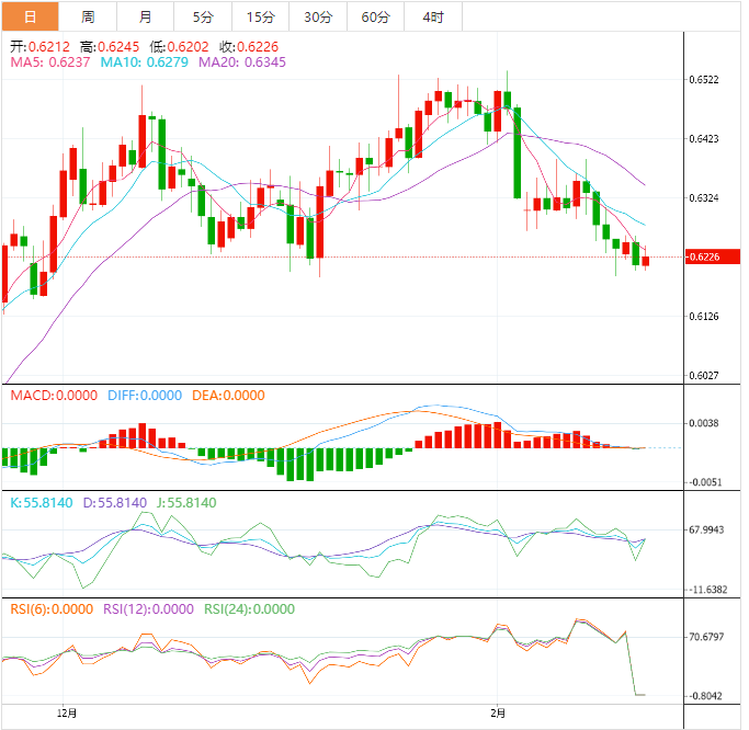 纽元/美元在过去几周一直下跌,此前在四小时图形成了双顶形态,这传达了一种看跌的反转。纽元/美元已跌至1月6日低点绘制的水平支撑位0.6190附近。如果滑落到上述水平支撑之下,将触发下行势头。
