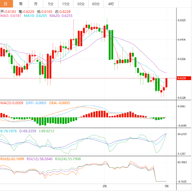 基本面上,一系列令人失望的数据导致澳元暴跌,纽元/美元一度承压下跌0.2%。然而,发稿时,中国方面的数据积极,纽元/美元交投于0.6185,自低点反弹。与此同时,日内将公佈一些中国的数据可能会支撑纽元/美元。澳元/美元获得一些支撑,也将提振纽元/美元。中国财新制造业採购经理人指数(PMI)实际为51.6(期值50.7,前值为49.2),这也对纽元/美元构成支撑。