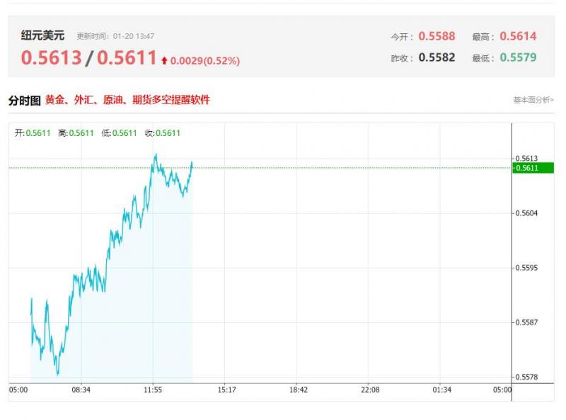 纽元兑美元今日汇率最高0.5611 ,最低0.5611,涨跌0.0029 ,涨跌幅0.52% 。