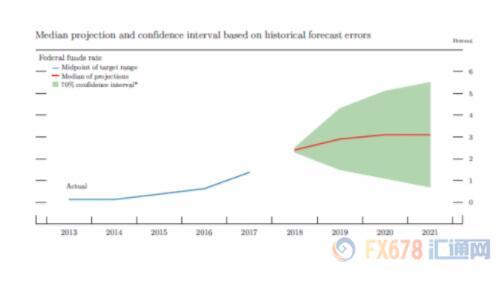 从美联储扇形图来看,FOMC有70%的信心认为,2018年联邦基金利率在2.3%-2.5%区间内,2019年1.5%-4.3%,2020年1.0%-5.0%,2021年0.6%-5.4%。FOMC与会者中0人认为GDP增速预期的不确定性减少,14人认为大致相似,3人认为增加;0人认为GDP增速预期有下行风险,14人认为风险大致均衡,2人认为有上行风险。