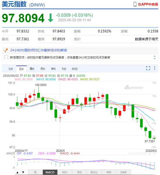 6月2日,美元指数(97.6282 -0.2121 -0.22%)跌势难止,人民币(7.1040 -0.0237 -0.33%)中间价报7.1167,上调148点,上一交易日中间价报7.1315,在岸人民币上一交易日收报7.1340。