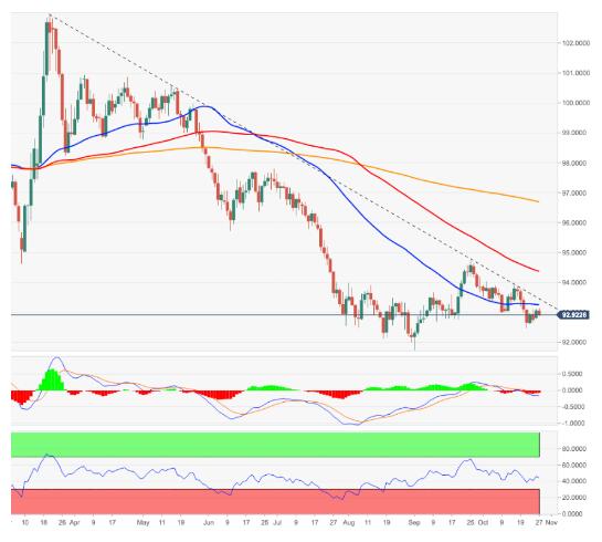 与此同时,偶尔的看多尝试似乎仍在93.30区域受到抑制,该区域汇聚55日移动平均线和6个月阻力线。突破这一区域将为看向上周(10月15日)93.90左右的高点打开大门。