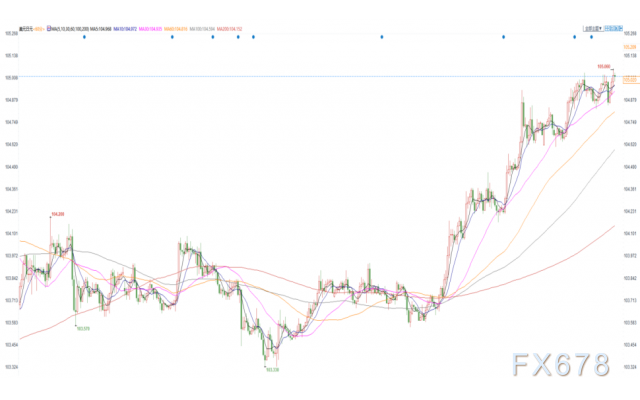 周二(2月2日)欧洲时段盘中,美元兑日元延续了本周强劲的上涨势头,汇价继续冲高并突破了关键的105关口,最高触及105.06。