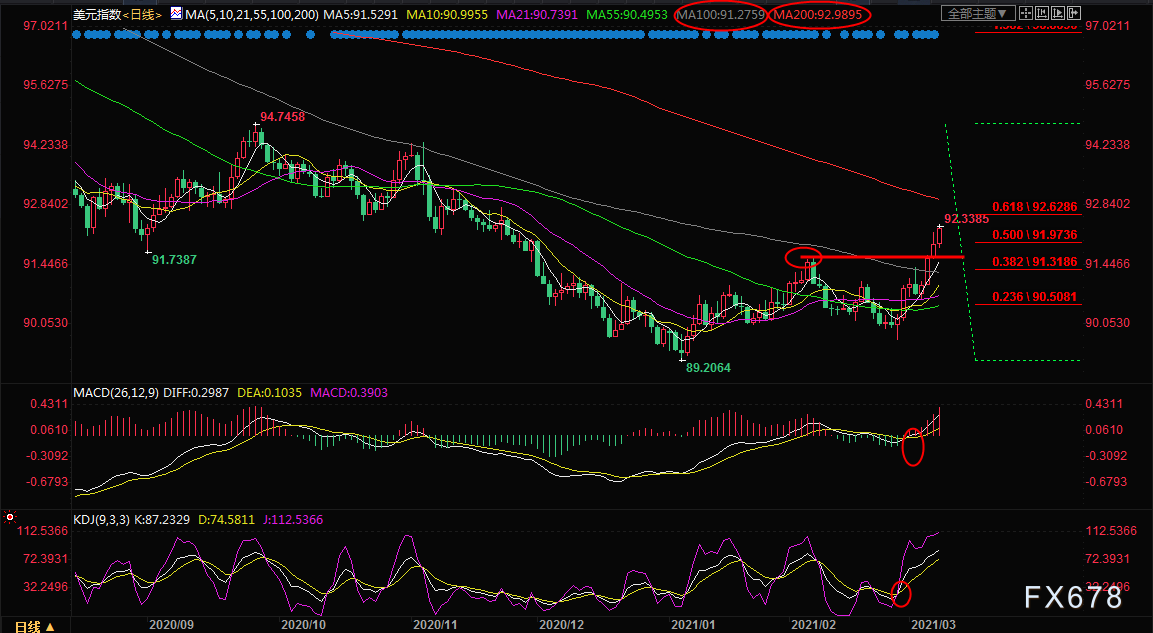 周一(3月8日)美元指数延续涨势,最高触及92.34,为11月25日以来新高。从技术面来看,美元指数自1月6日创下近三年新低至89.20以来的近三个月时间内,汇价已经初步完成了震荡筑底的过程,中长线有望迎来一波涨势,短线目标参考200日均线92.99附近。