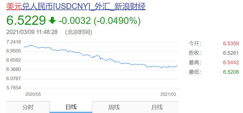 提供了今日美元兑人民币汇率(2021年3月9日):